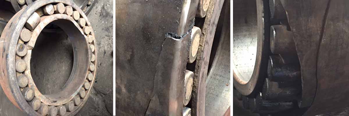 23072CA/C3调心滚子轴承,承受了过载的轴向负荷,导致外圈一侧破裂。有的内圈小挡边另一侧磨损碎裂。