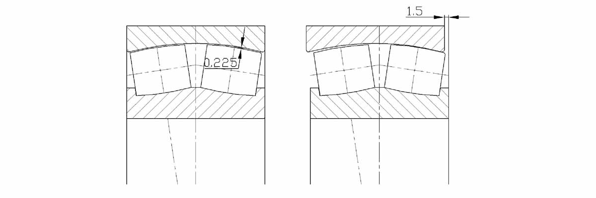 由于23072CA/C3是调心滚子轴承,内外圈在有轴向力产生的条件下,易产生相对的轴向位移,而且轴向位移的大小,取决于轴承内部径向游隙值,即径向游隙值越大,产生的轴向位移就越大(轴承内部窜辊);经过计算,当轴向移动至游隙为零时,内外圈相对轴向位移为1.5mm,如图: